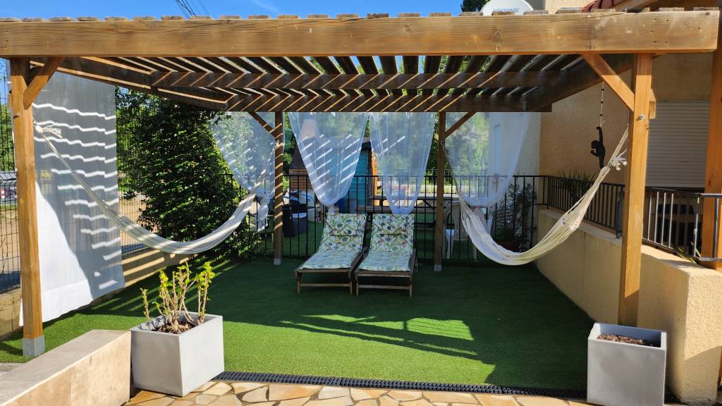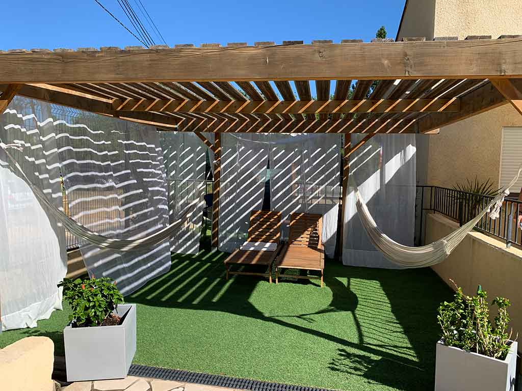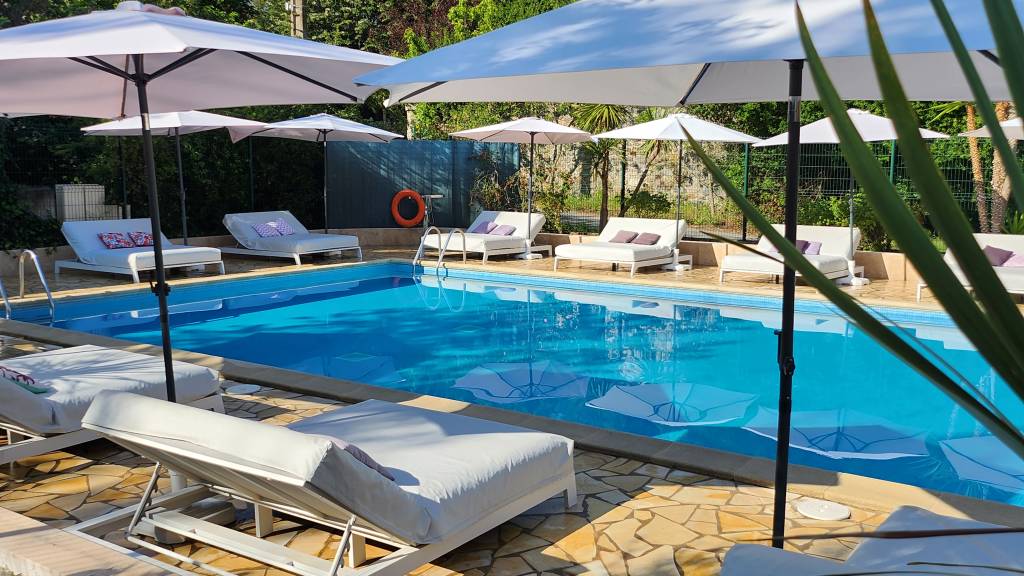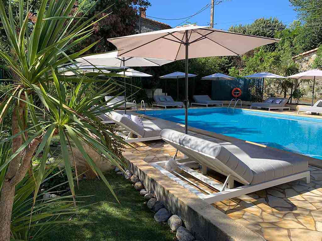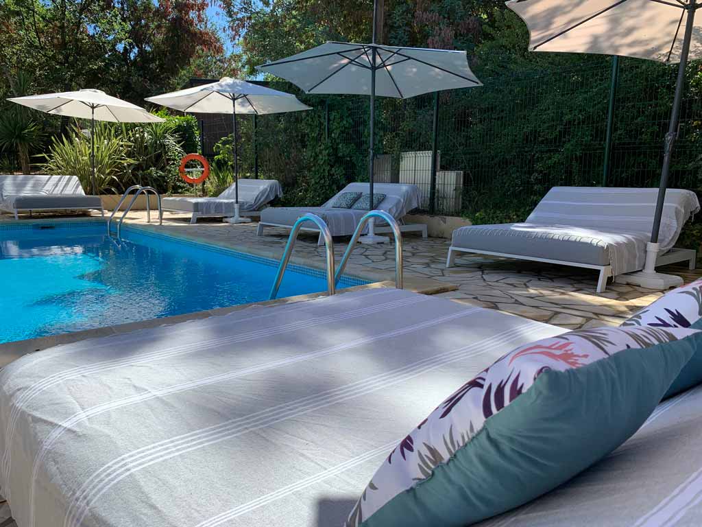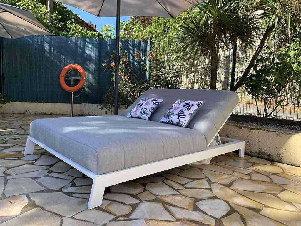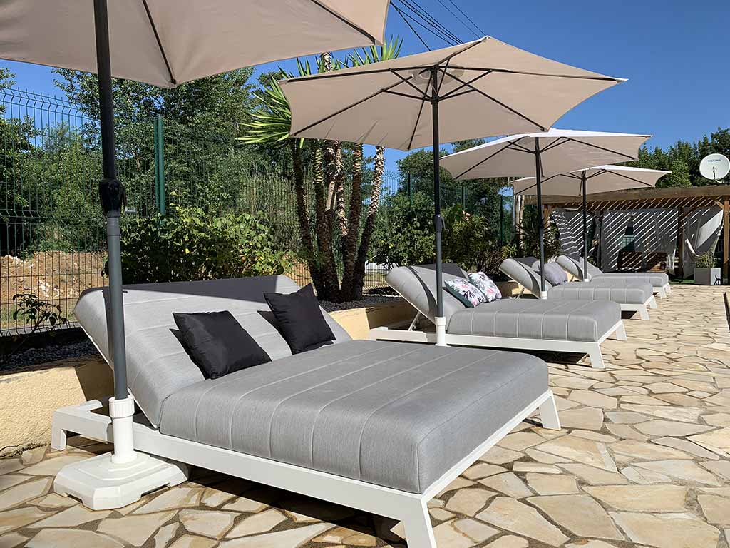 15m/7m – Sa plage avec 12 bains de soleil double avec parasols, 2 bains simples en bois et 2 hamacs sous persienne.