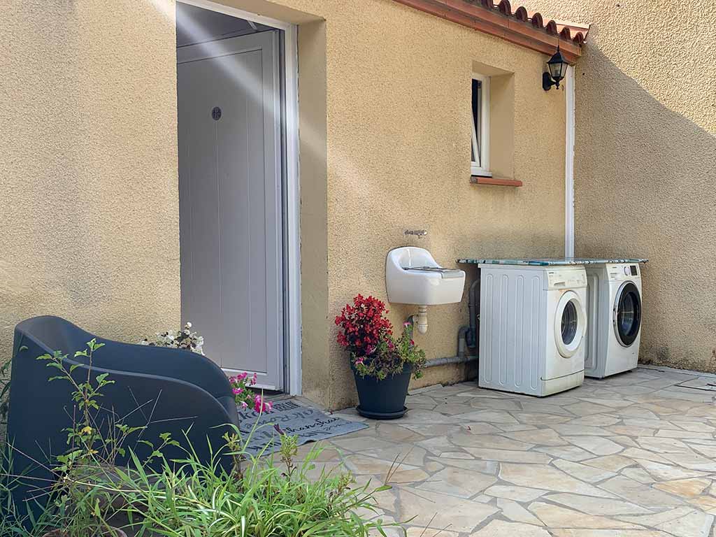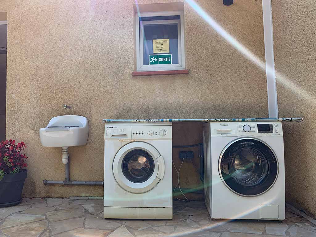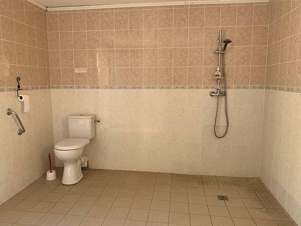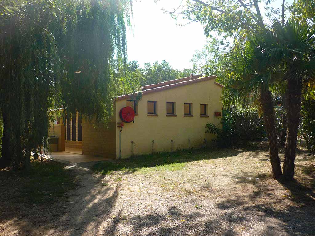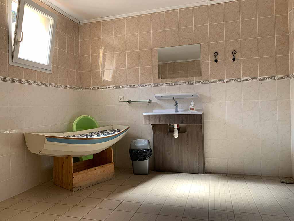 Un deuxième pôle avec une salle de bain de 6m² accessible aux personnes à mobilité réduite, 4 toilettes, 4 douches individuelles, 5 lavabos avec miroirs et prises électriques dans un espace carrelé de 20m², 4 bacs vaisselles avec eau chaude et de deux bassins à linge avec eau froide.