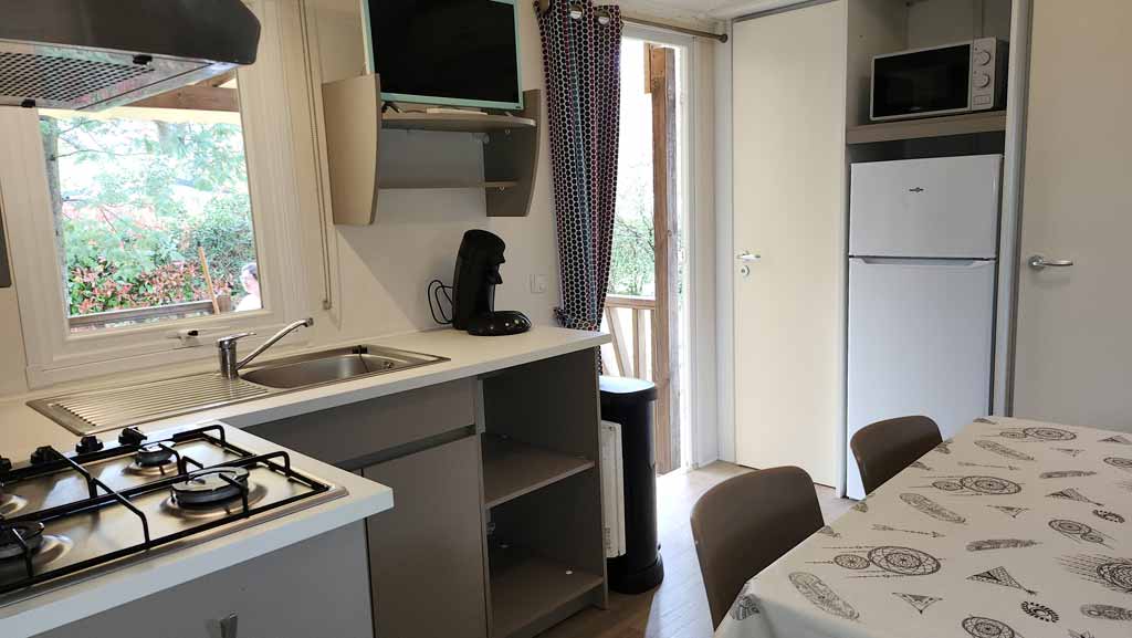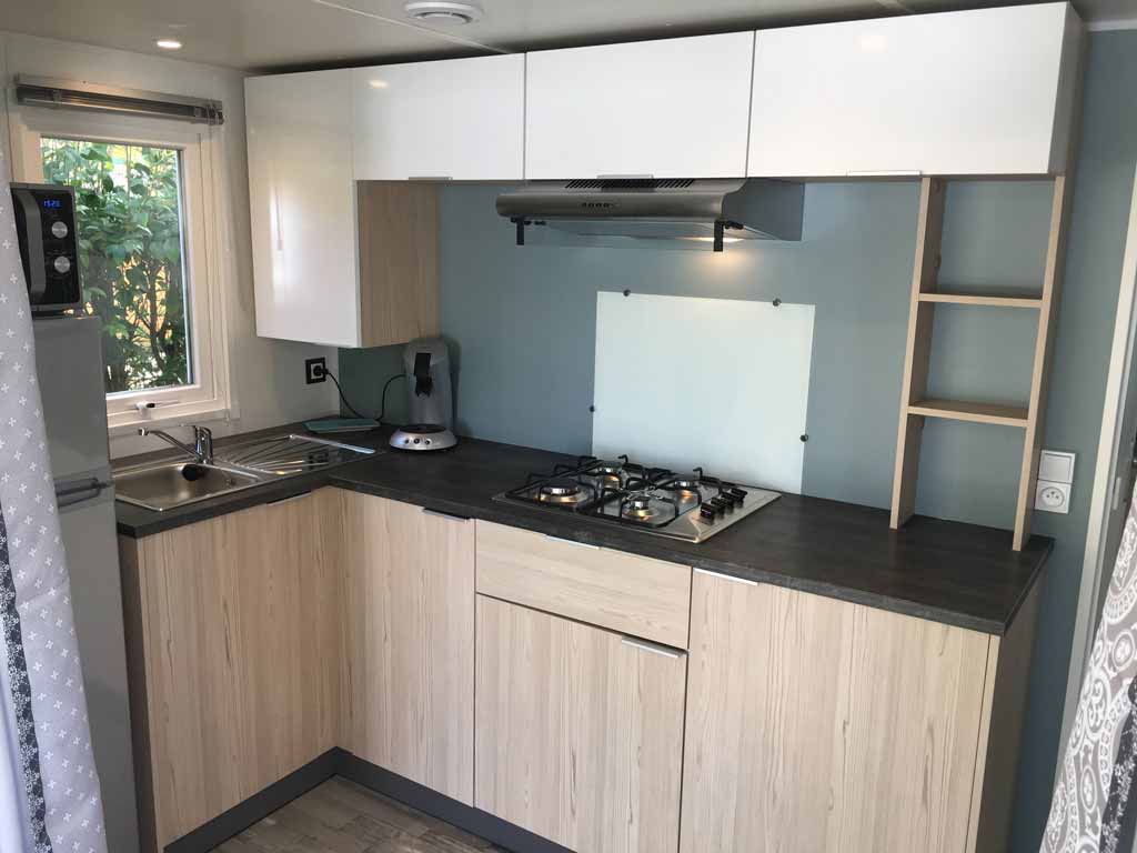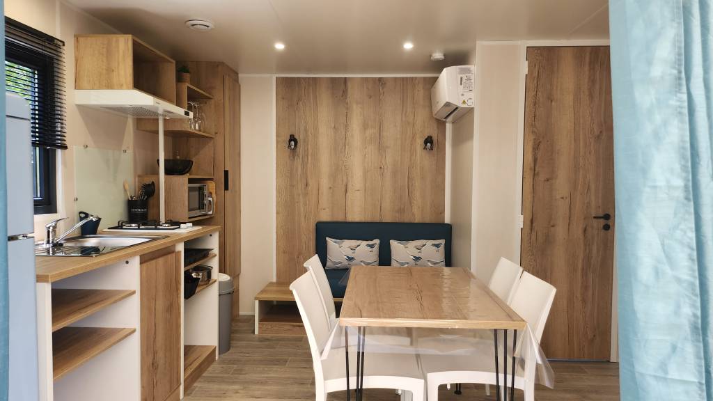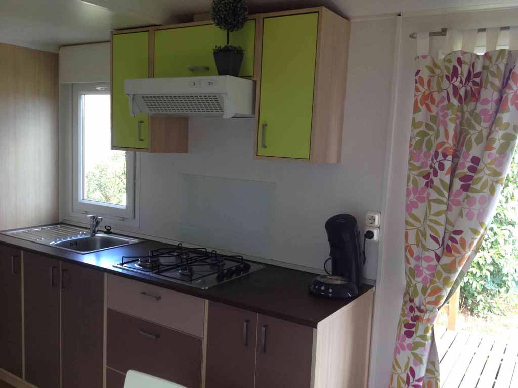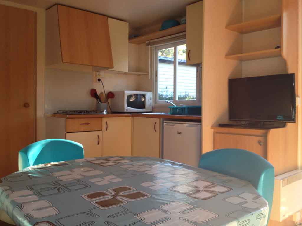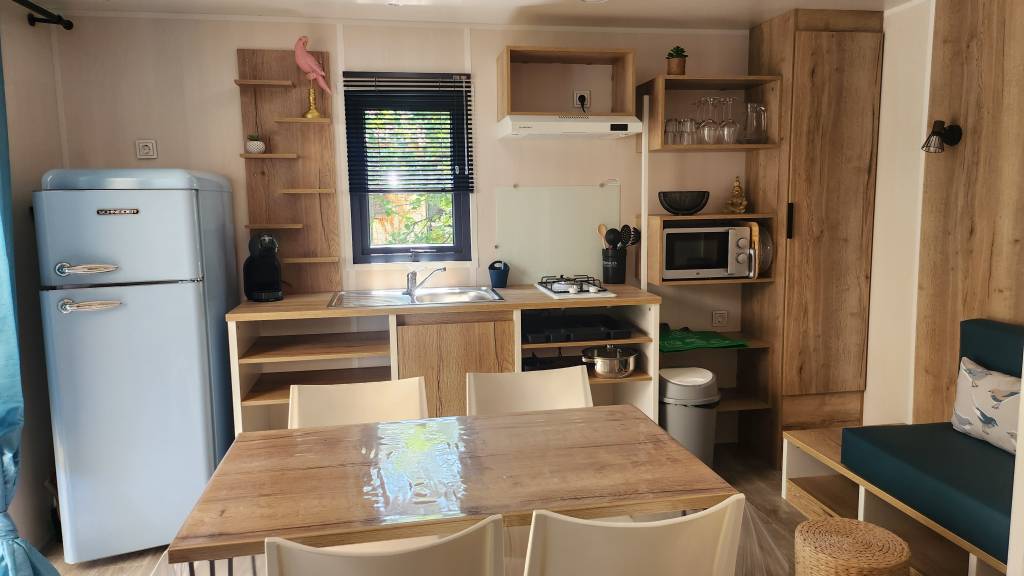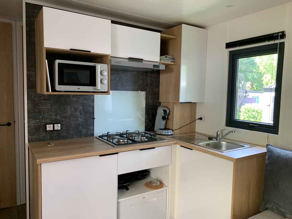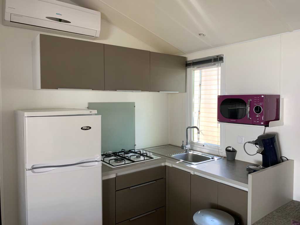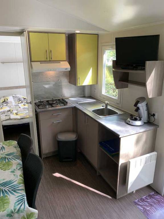 Equipement : Climatisation (en option),frigo-congélateur, cafetière senseo, micro-ondes, gazinière 4 feux.