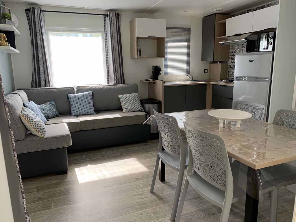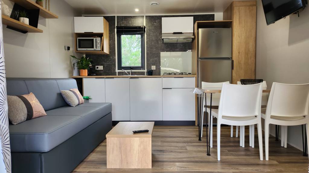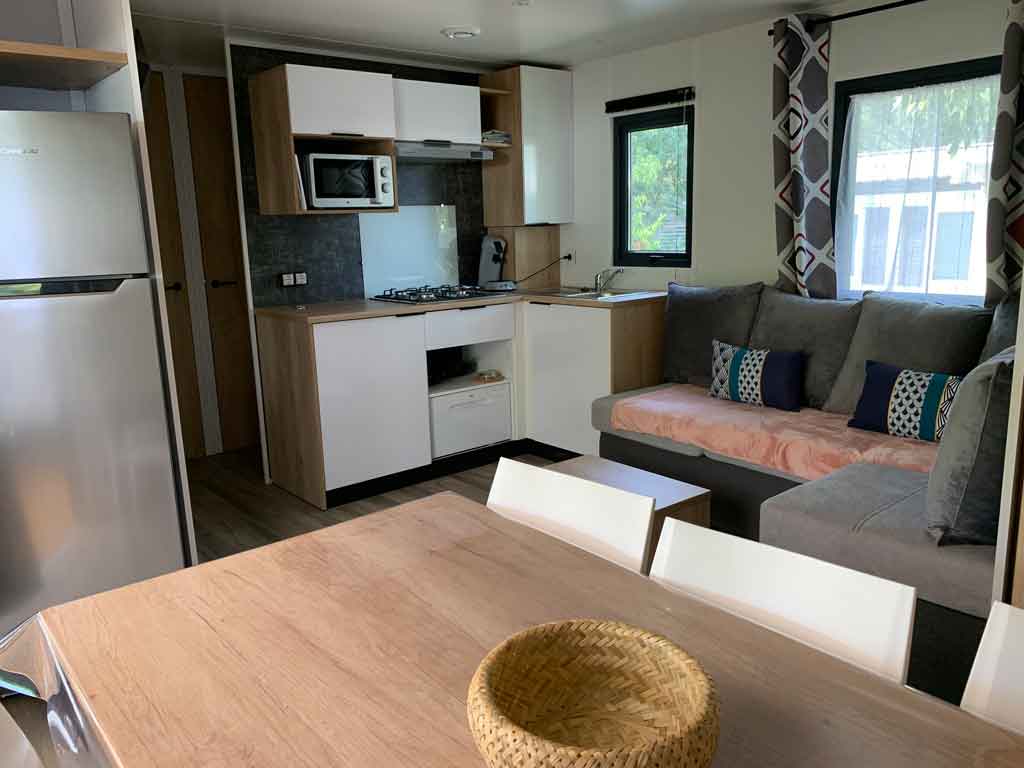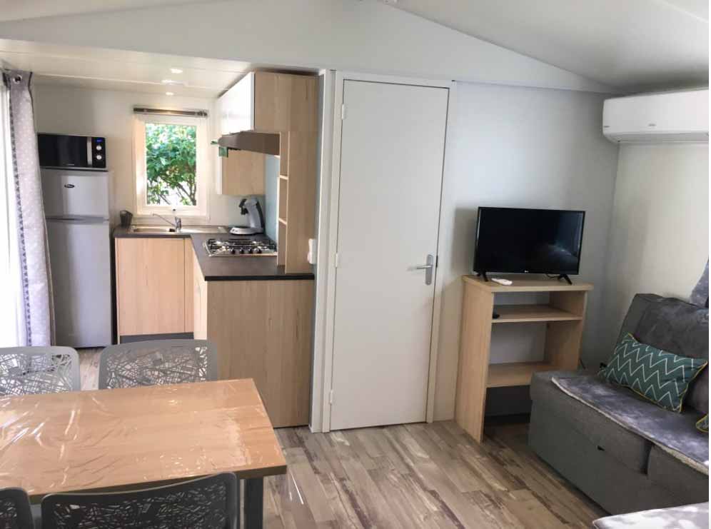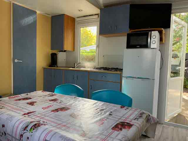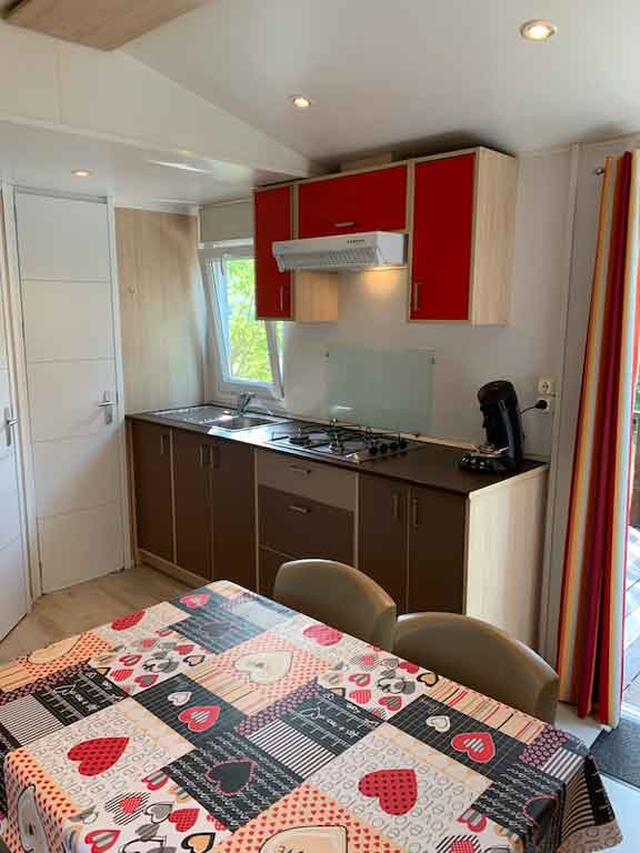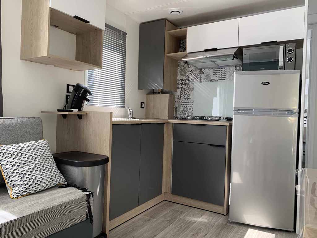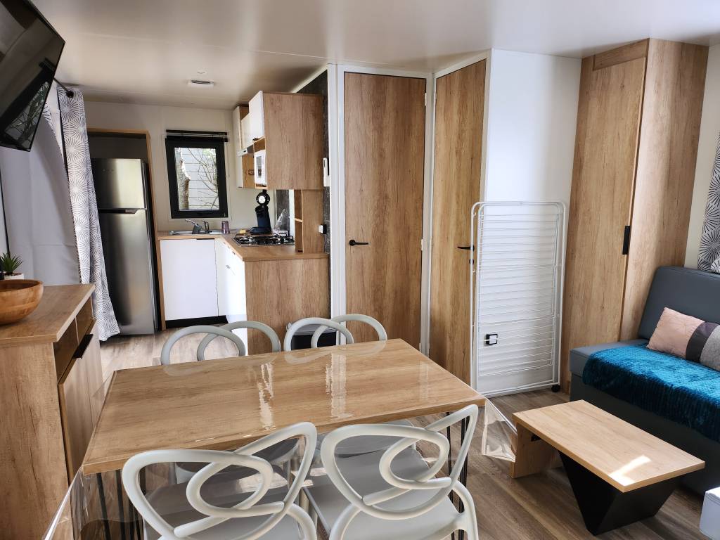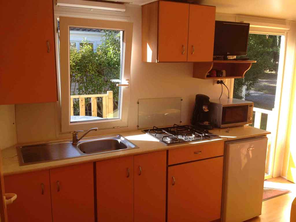 Equipement : Climatisation (en option),frigo-congélateur, cafetière senseo, micro-ondes, gazinière 4 feux.
