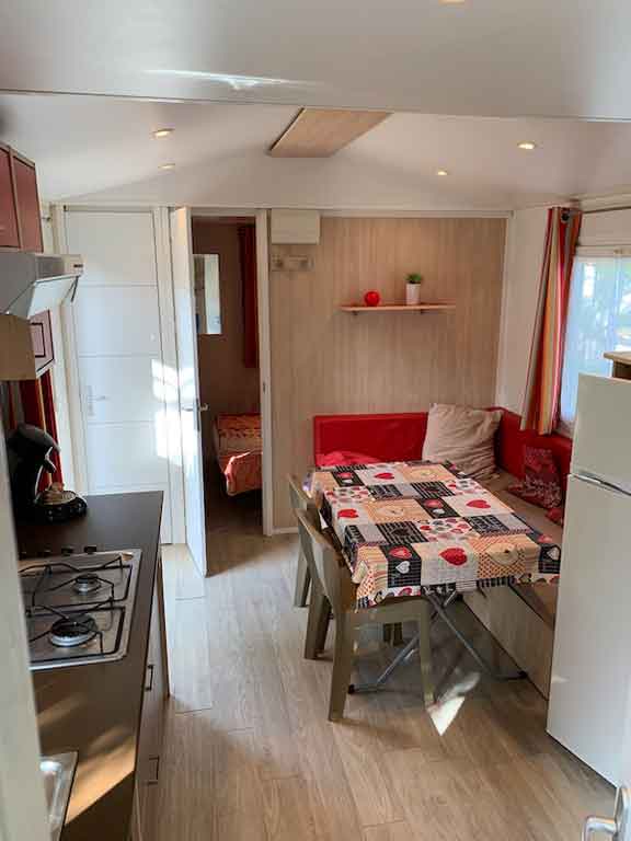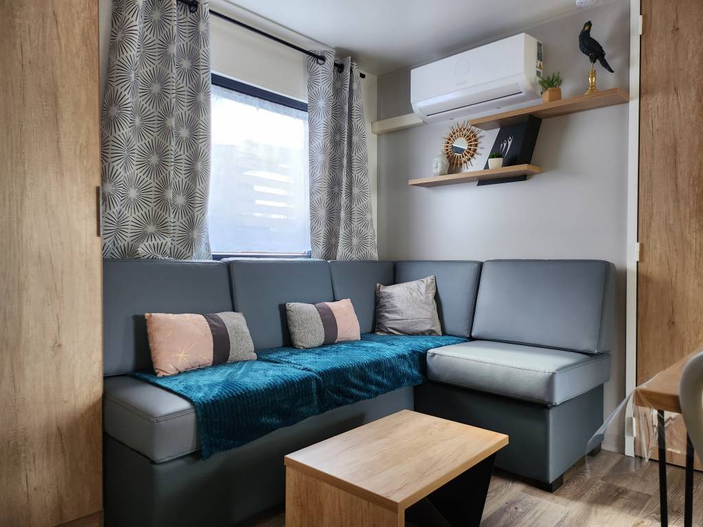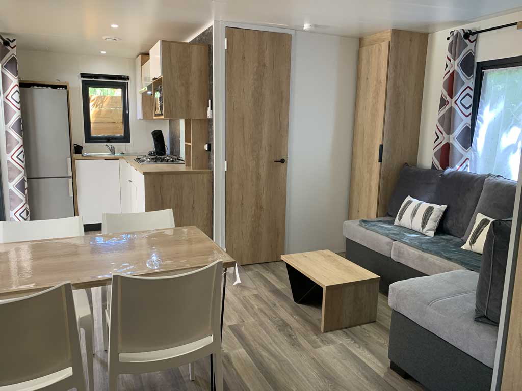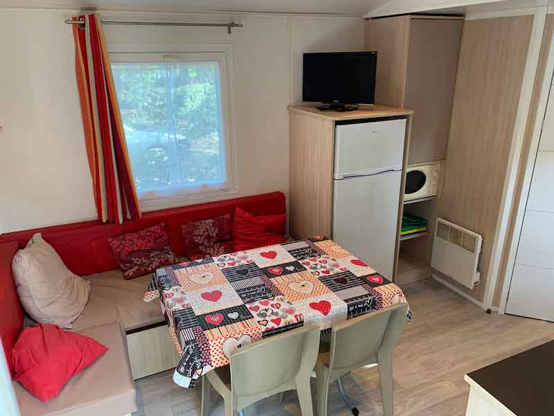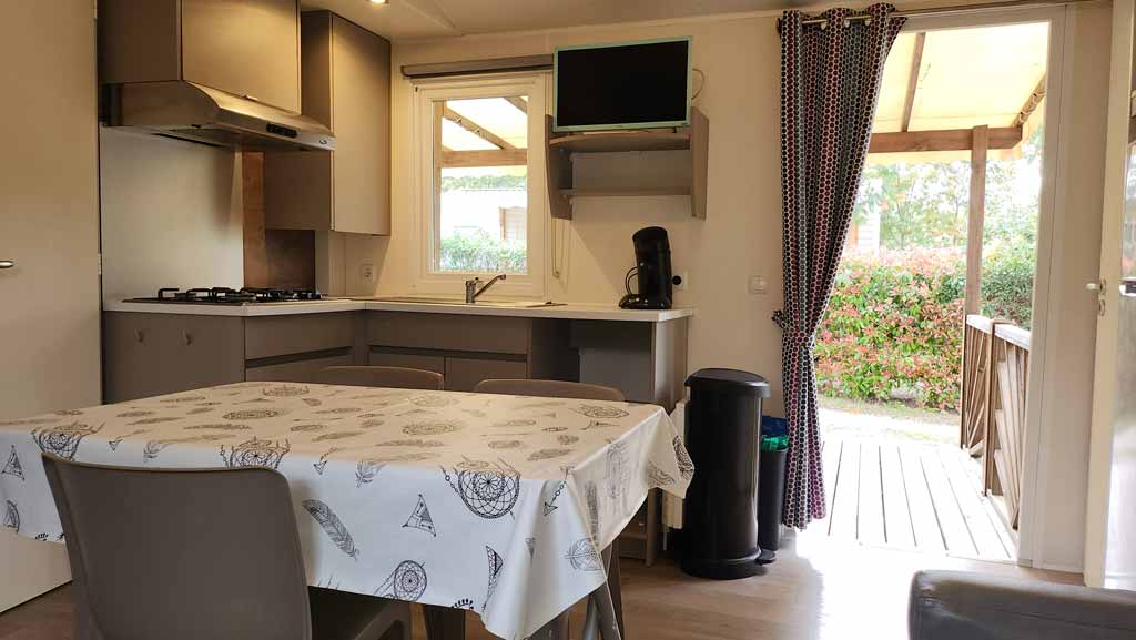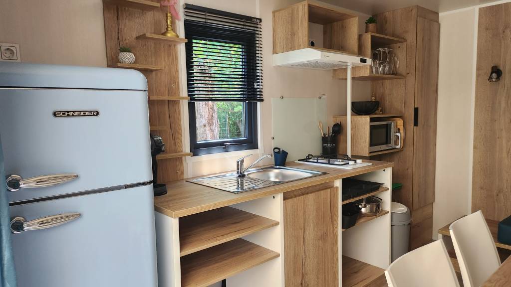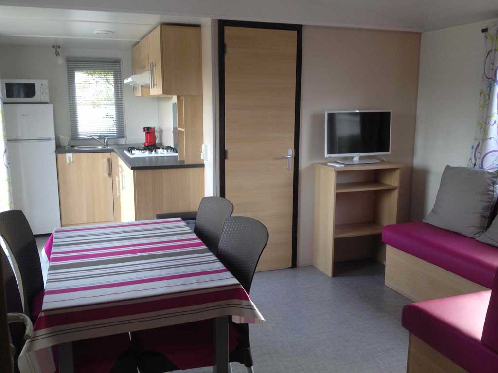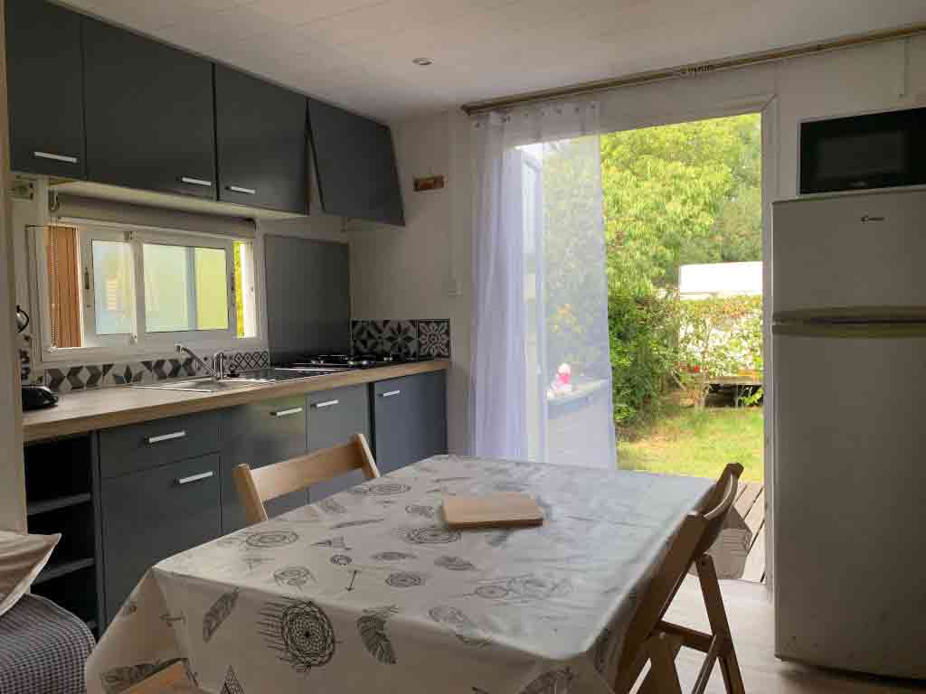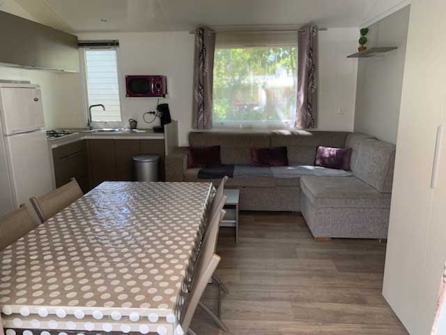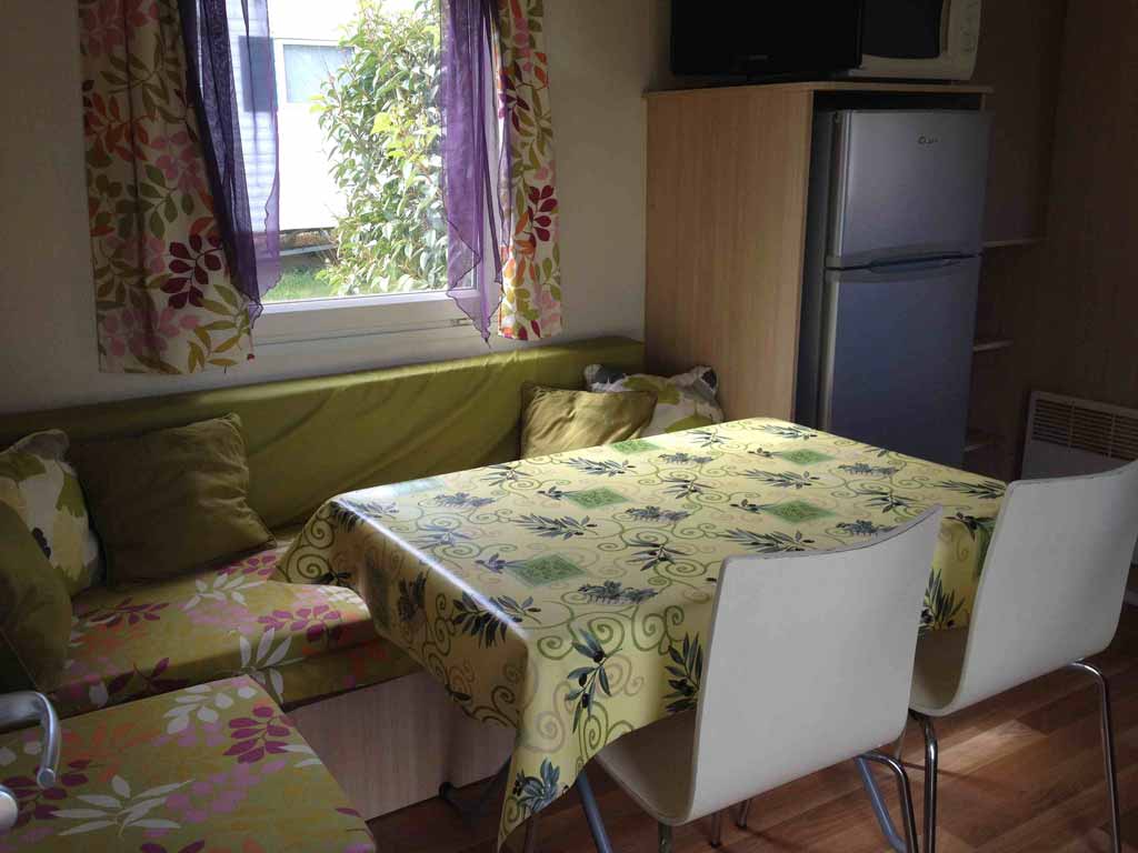 Equipement : Climatisation (en option),frigo-congélateur, cafetière senseo, micro-ondes, gazinière 4 feux.