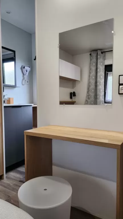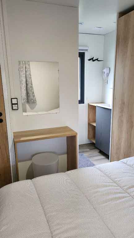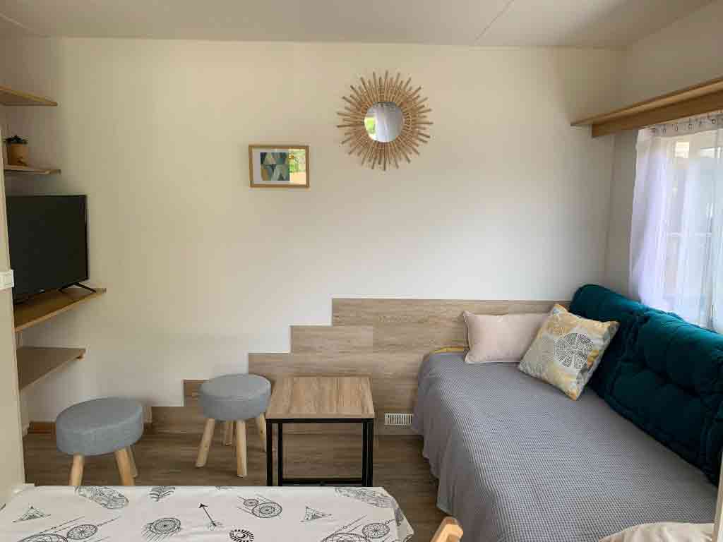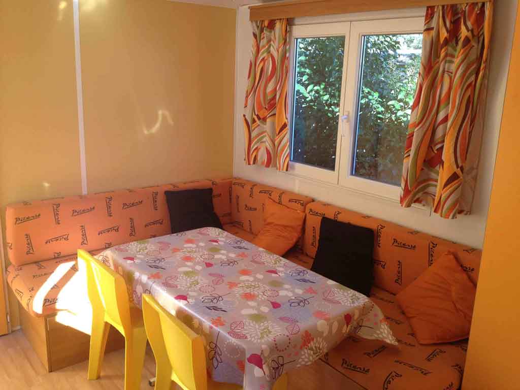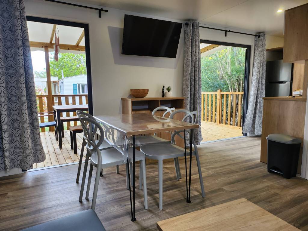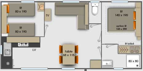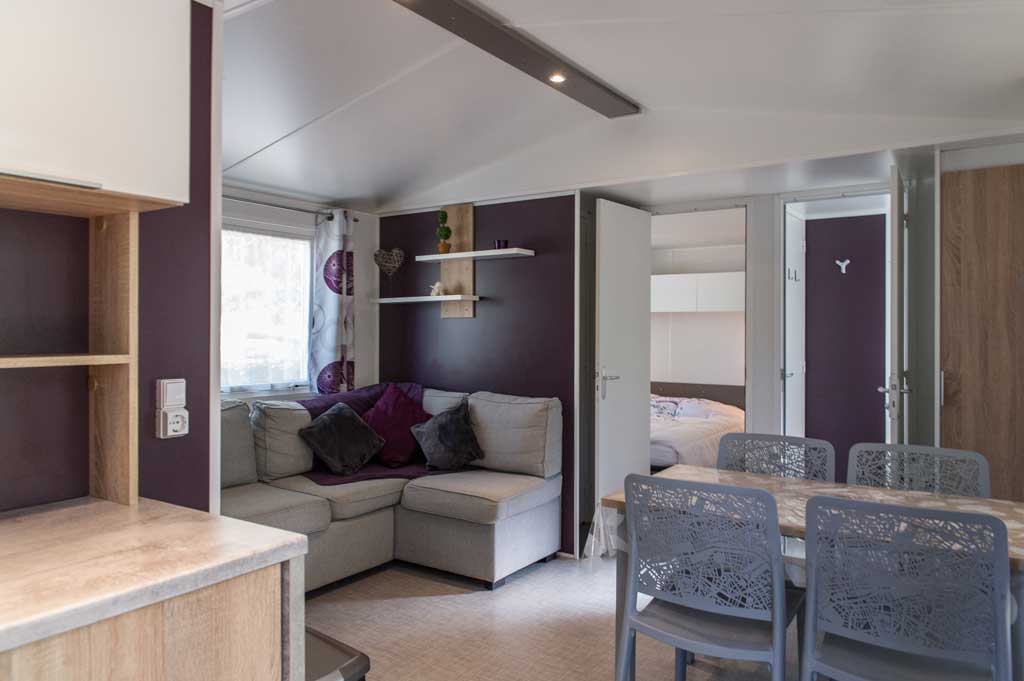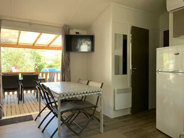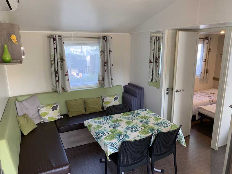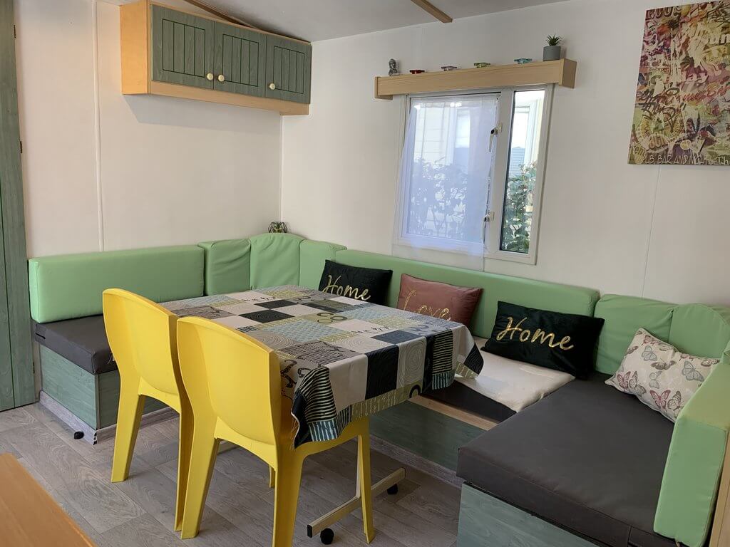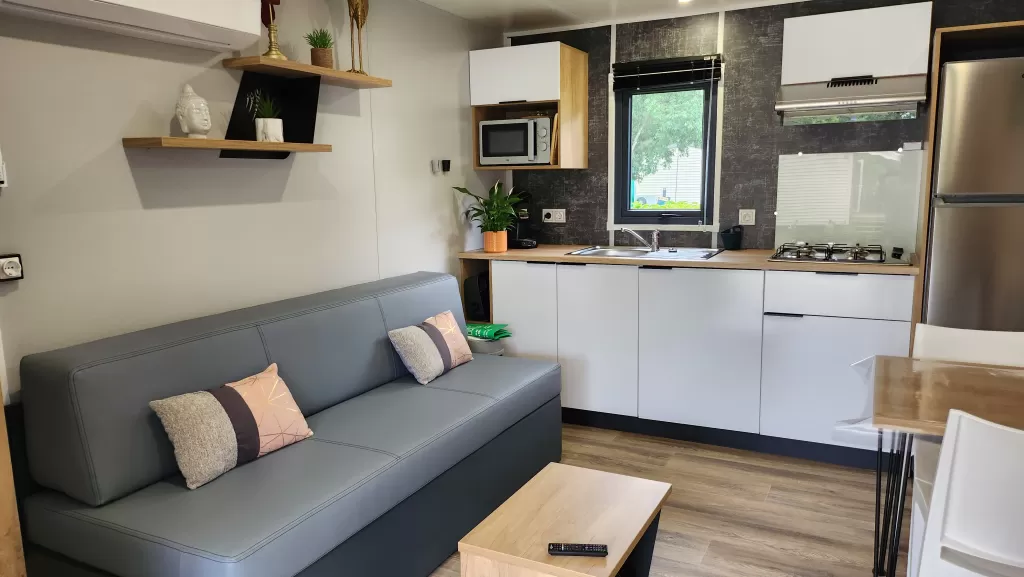 Equipement : Climatisation (en option),frigo-congélateur, cafetière senseo, micro-ondes, gazinière 4 feux.