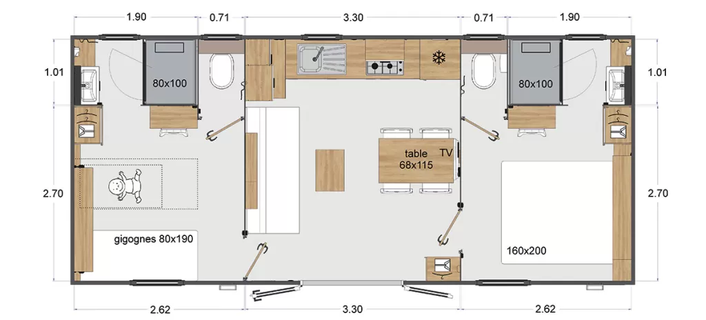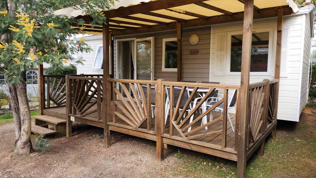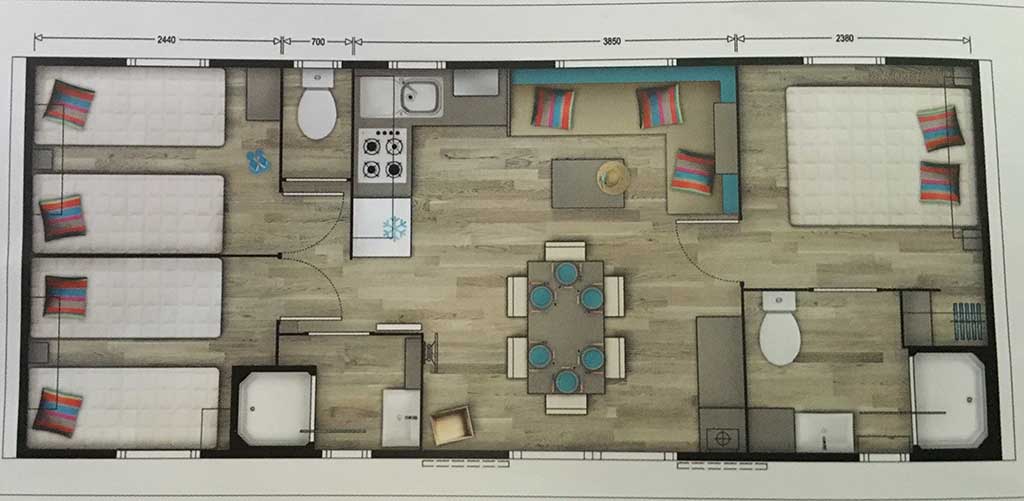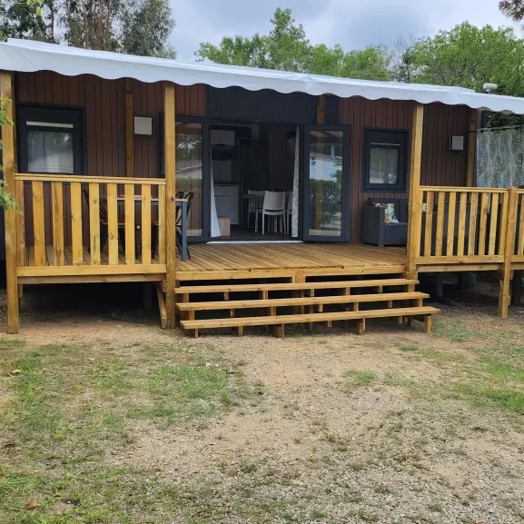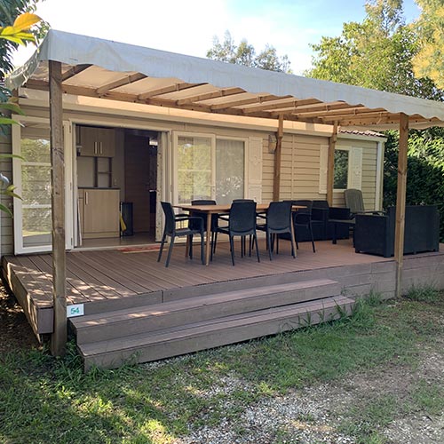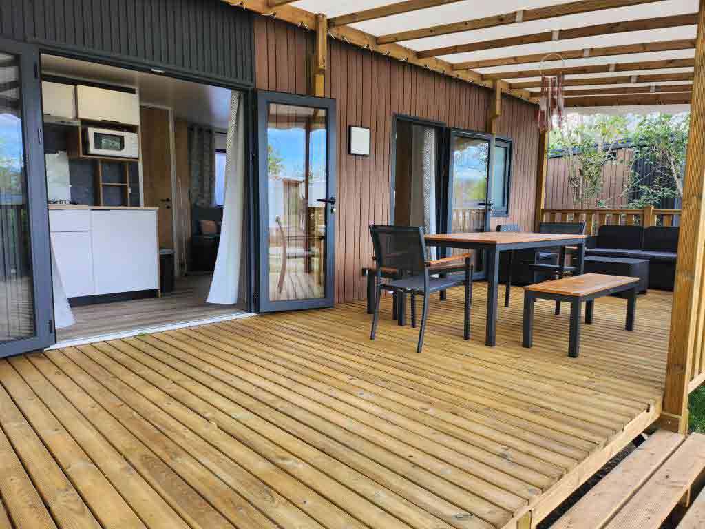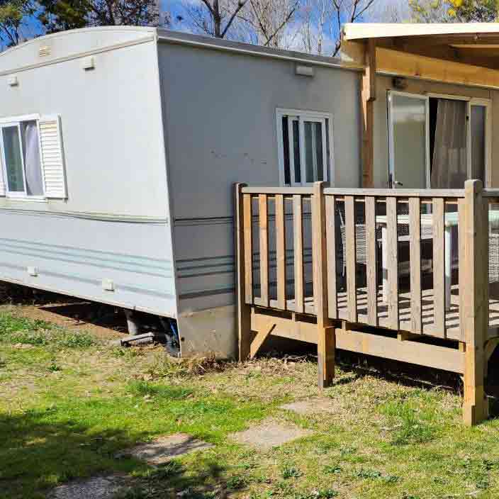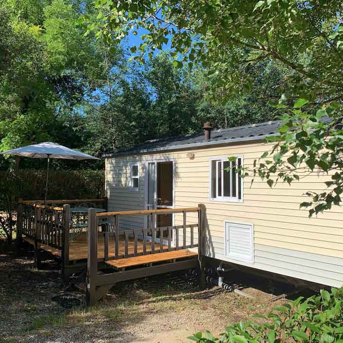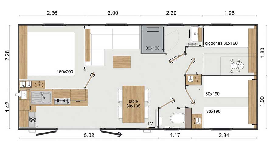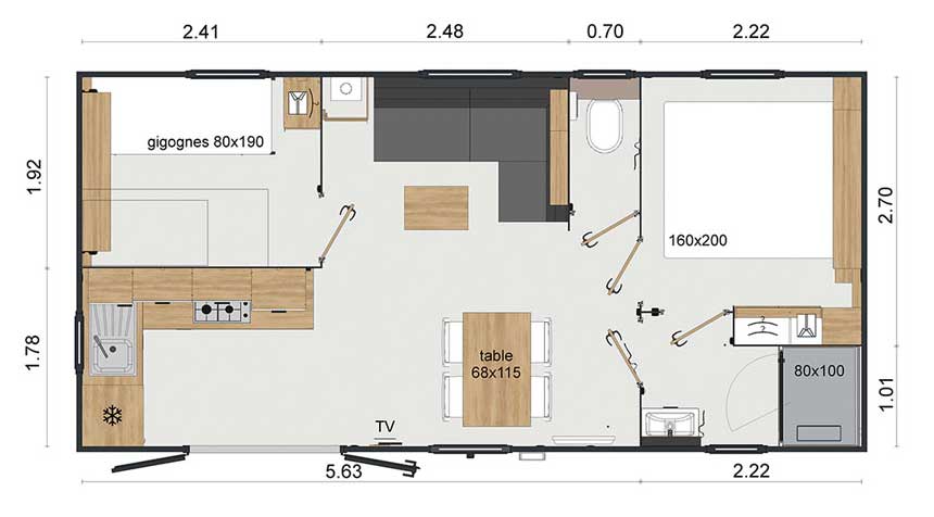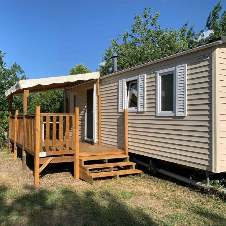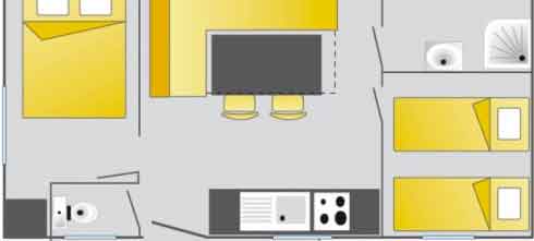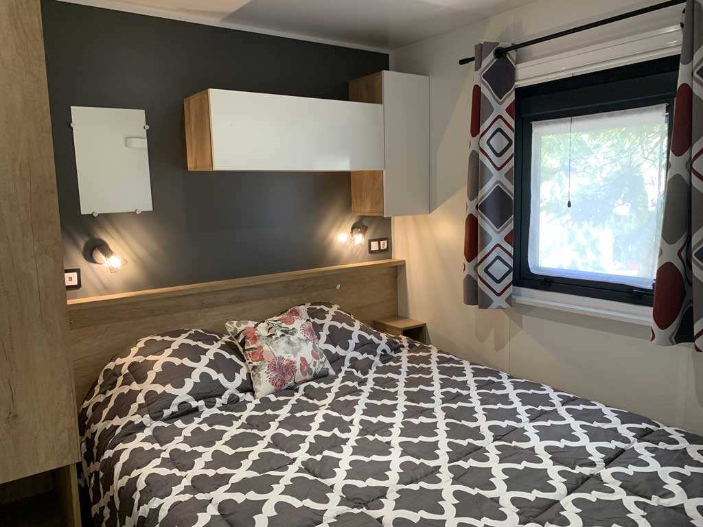 Equipement : Climatisation (en option),frigo-congélateur, cafetière senseo, micro-ondes, gazinière 4 feux.