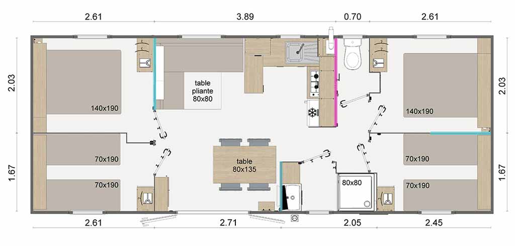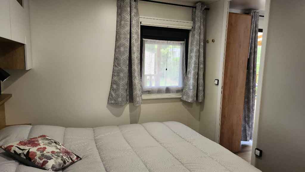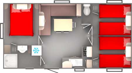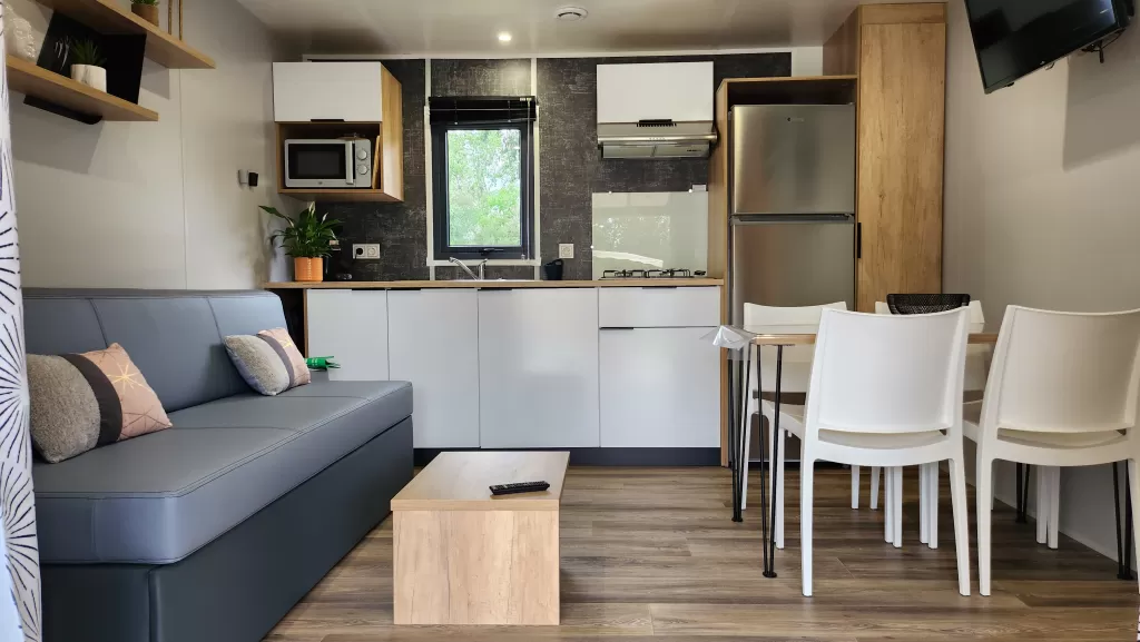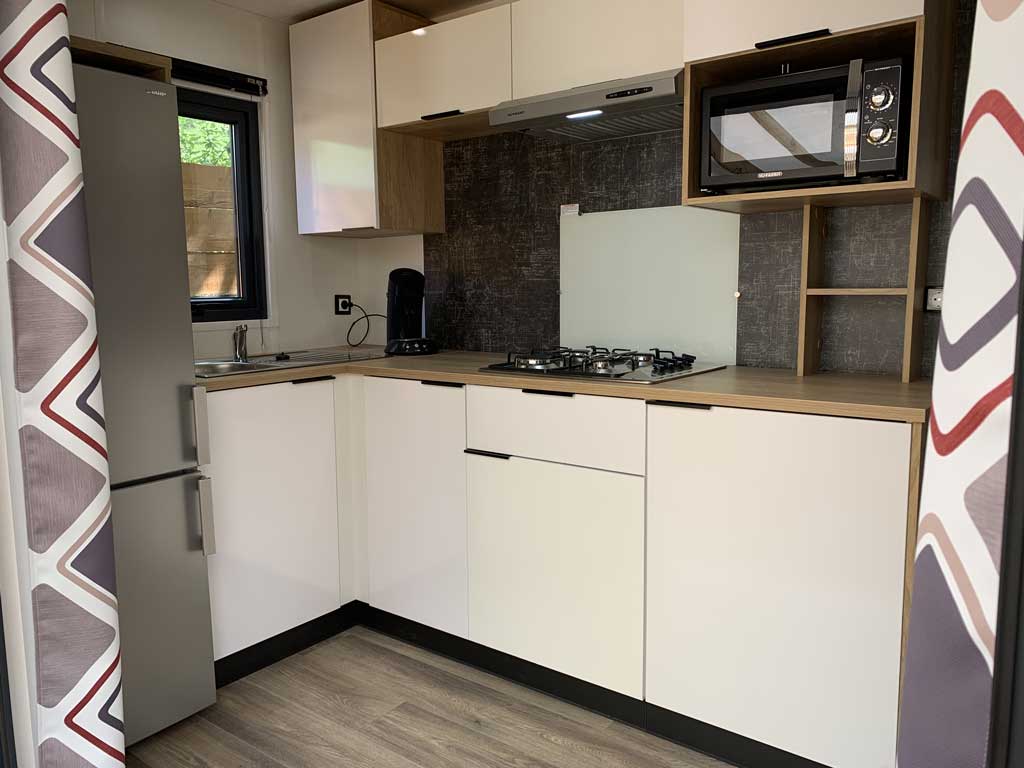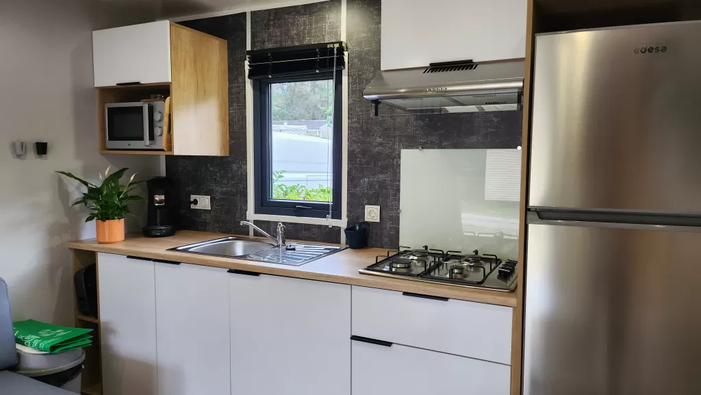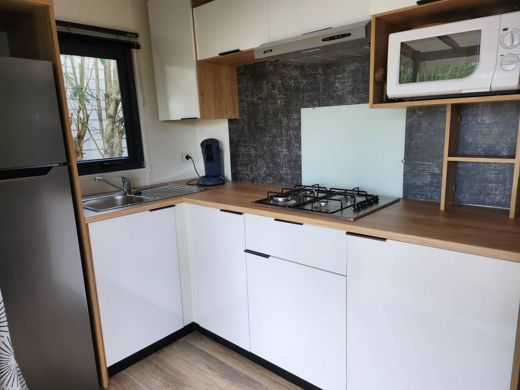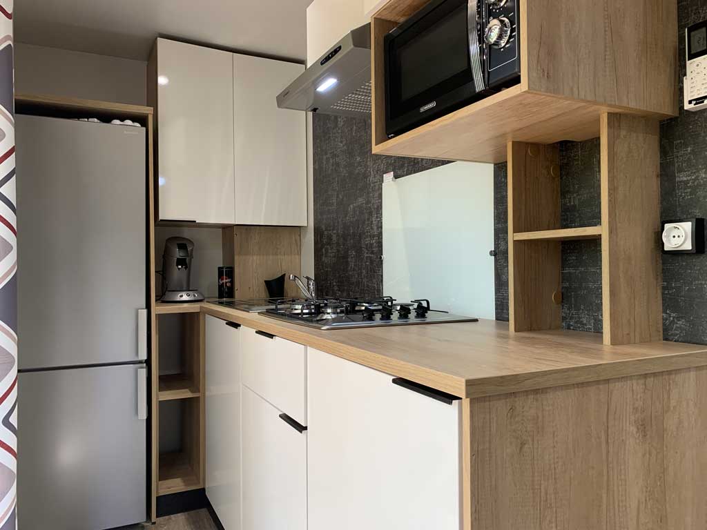 Equipement : Climatisation (en option), frigo-congélateur, hotte, cafetière senseo, micro-ondes, gazinière 4 feux