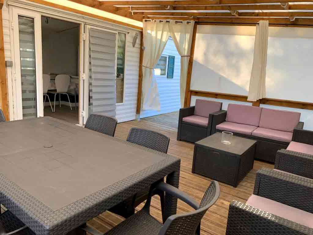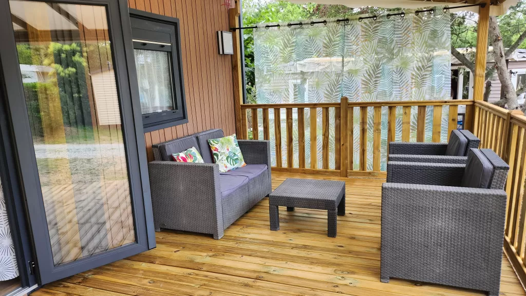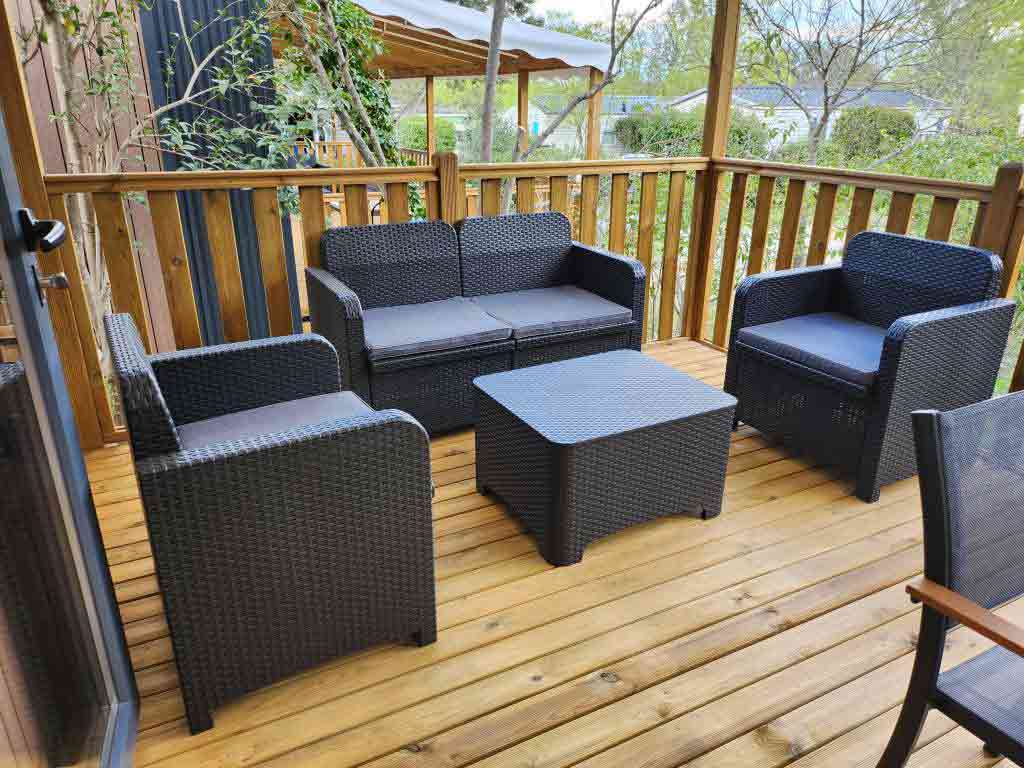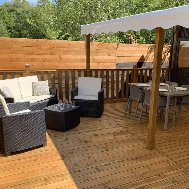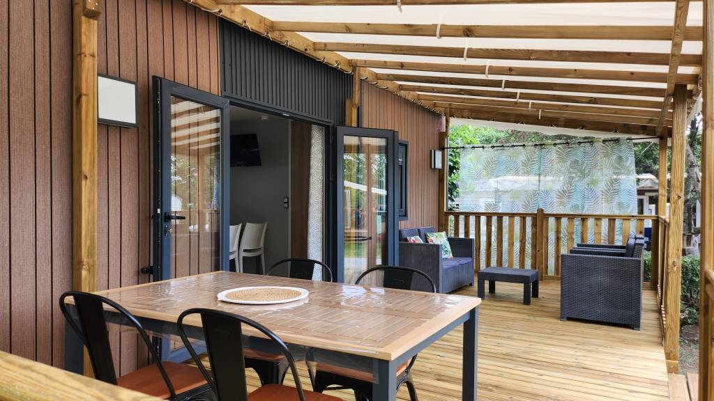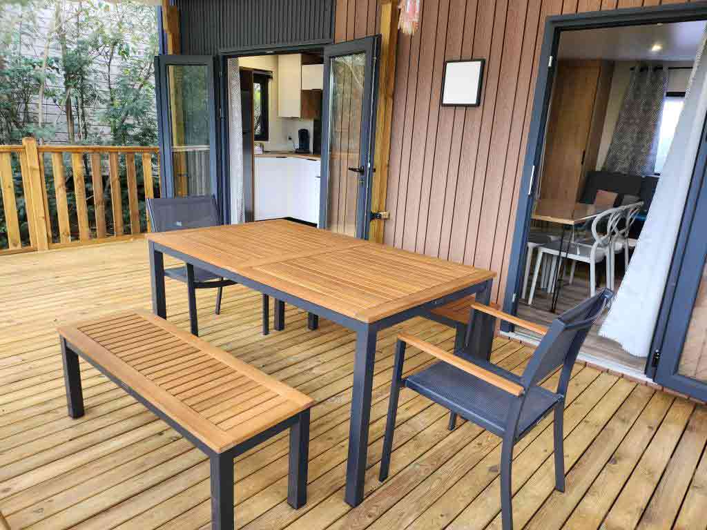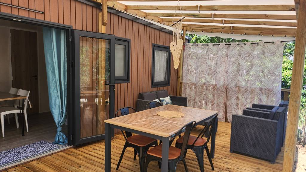 Extérieur : Terrasse couverte, table de jardin, salon de jardin.